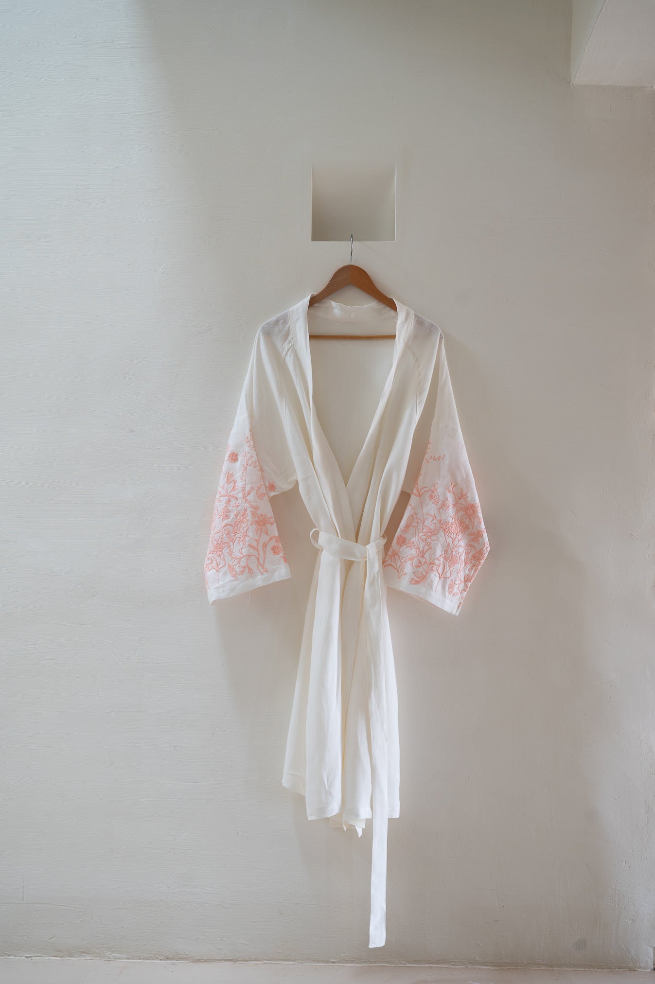 Bata de lino color marfil, bordada en las mangas con el diseño Lavándula en rosa. Nuestro lino, tratado con lavado en prenda, aporta suavidad y confort, convirtiendo esta pieza en un equilibrio perfecto entre estilo, elegancia y comodidad artesanal