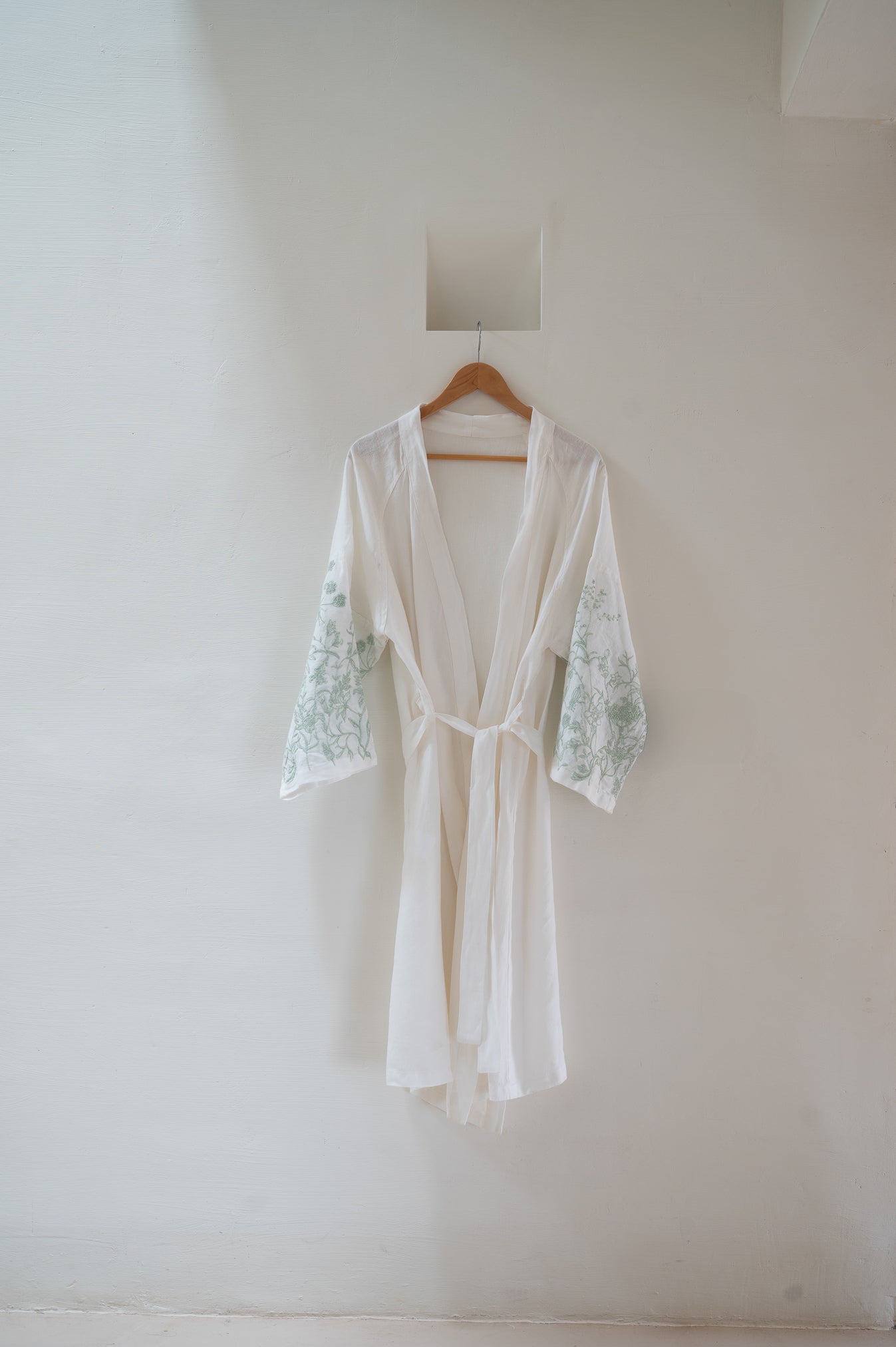 Bata Bordada · Puro Lino Lavado · Diseño Lavándula · Color Verde