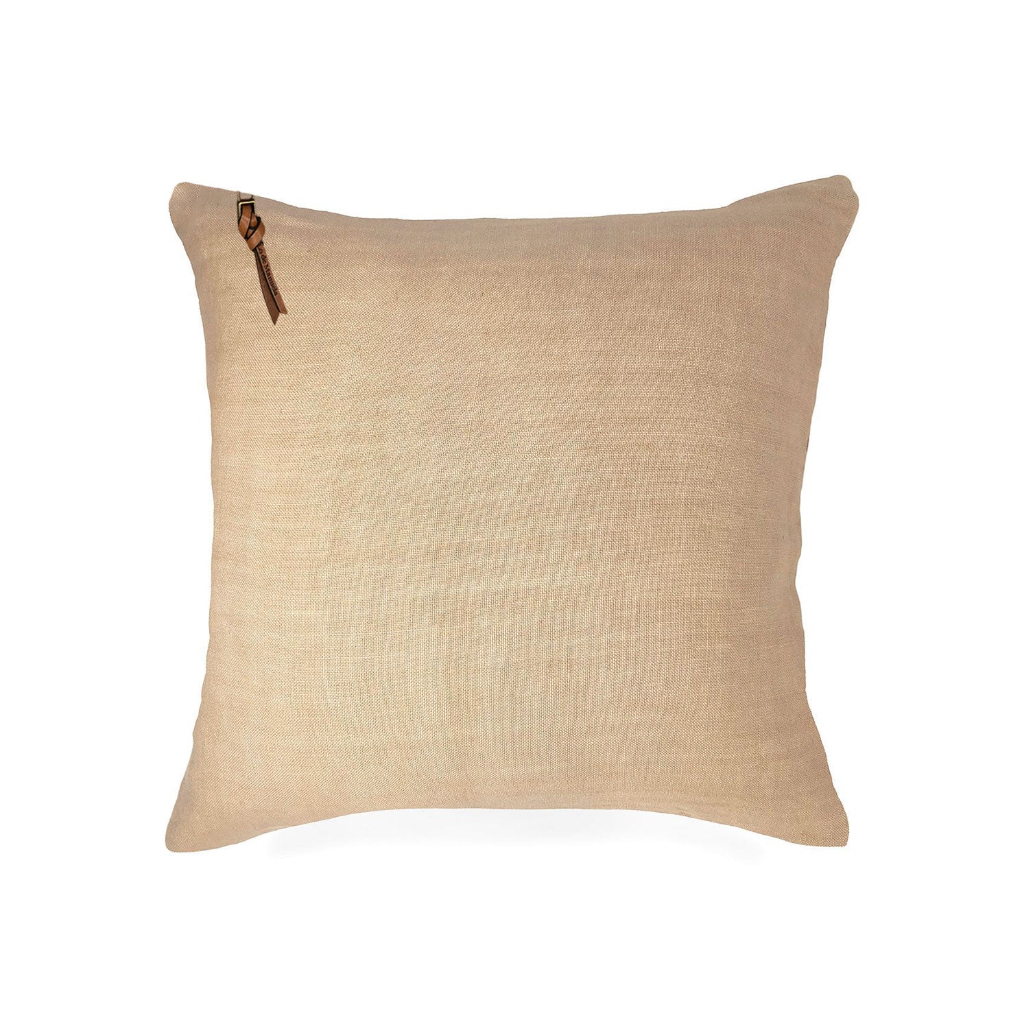 Funda de cojín de lino lavado con cremallera metálica en oro viejo y tirador de triple nudo de cuero.