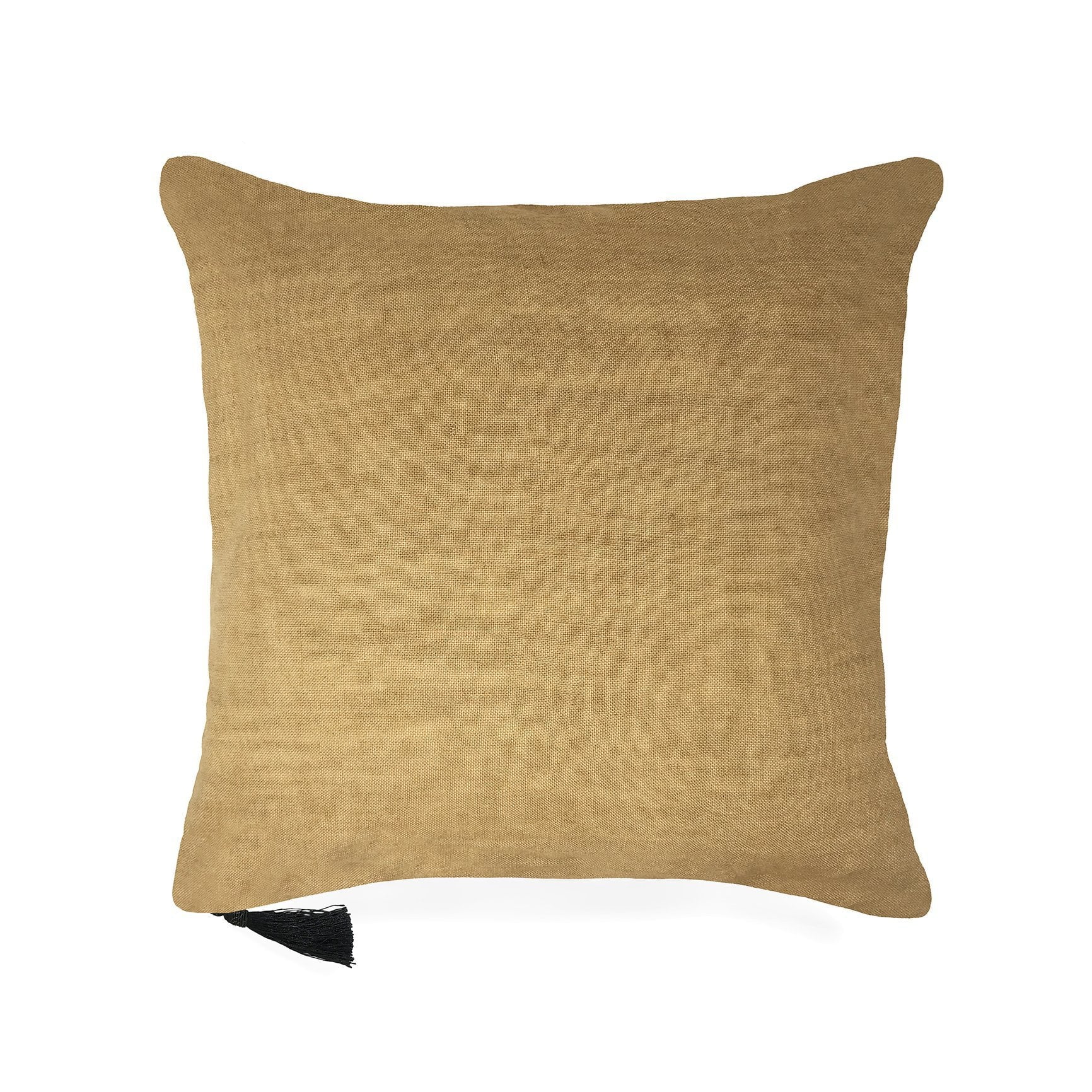 Ochre washed linen cushion cover with exclusive embroidered cardigan design, invisible zipper and black tassel detail.