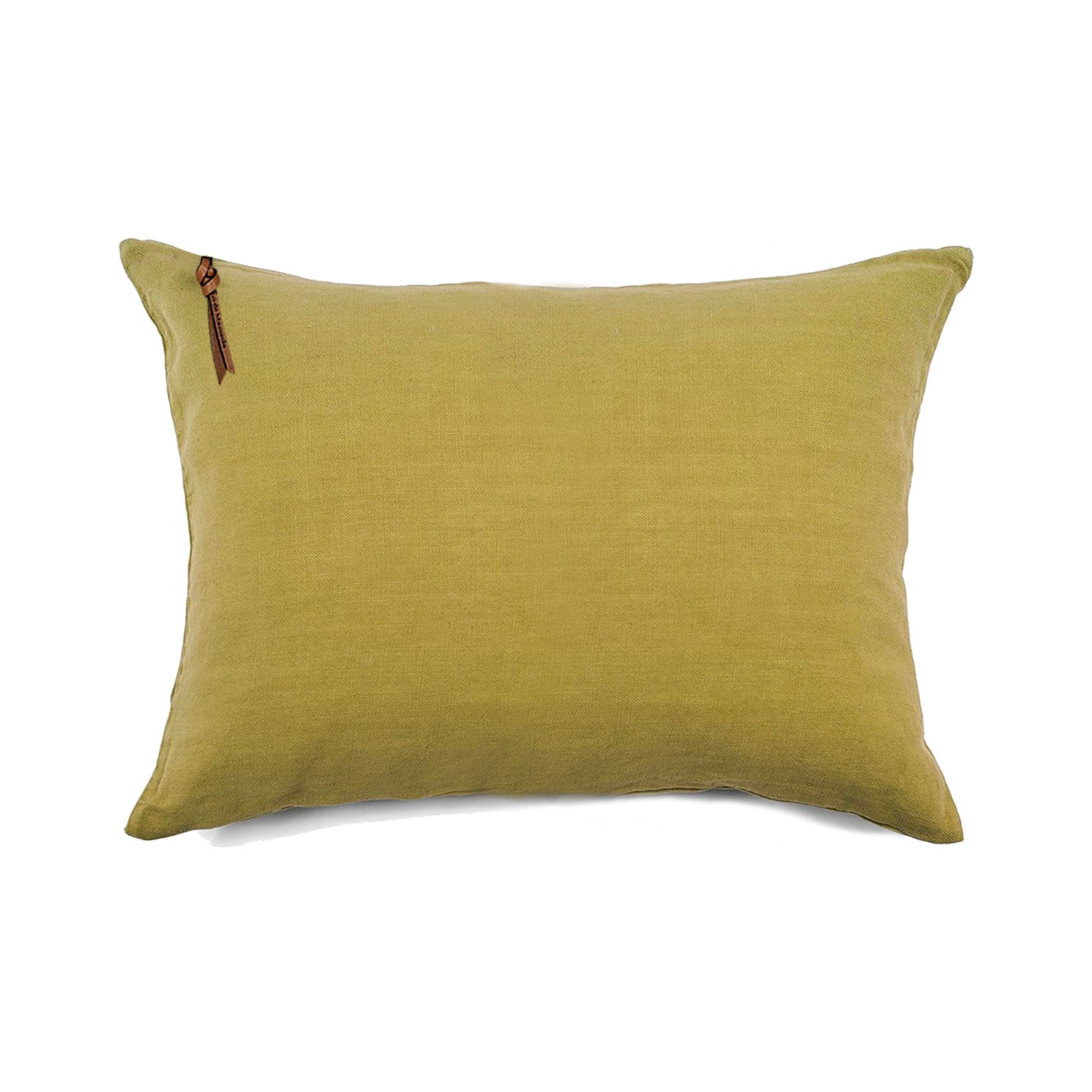 Washed linen cushion cover, with old gold metal zipper closure and leather triple knot pull.