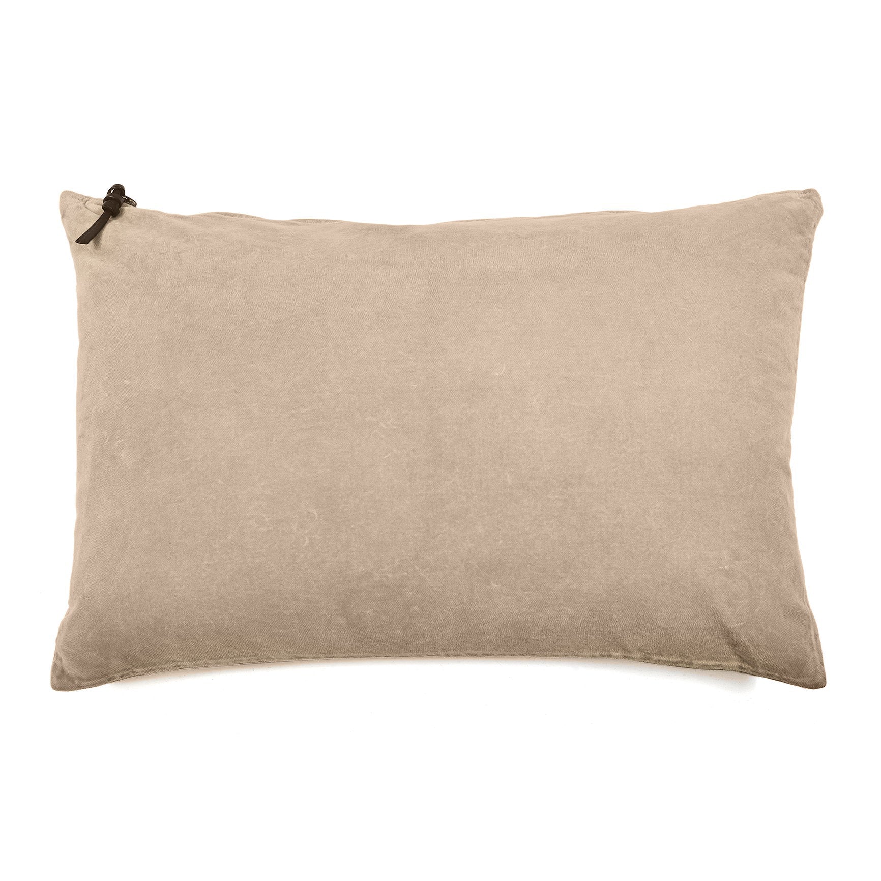 Washed velvet cushion cover, with old gold metal zipper closure and triple leather knot pull.