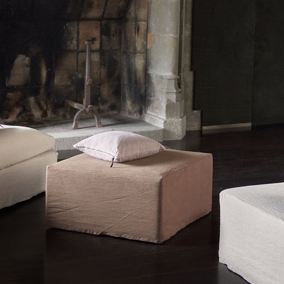 Puff con funda de lino lavado de 450 gr. Estructura de madera acolchada.