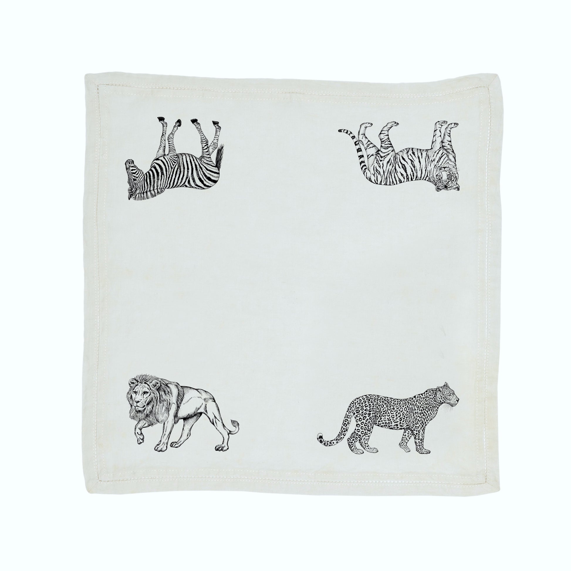 Servilleta de lino lavado estampado manua, diseño Serengueti. Acabado con vainica.