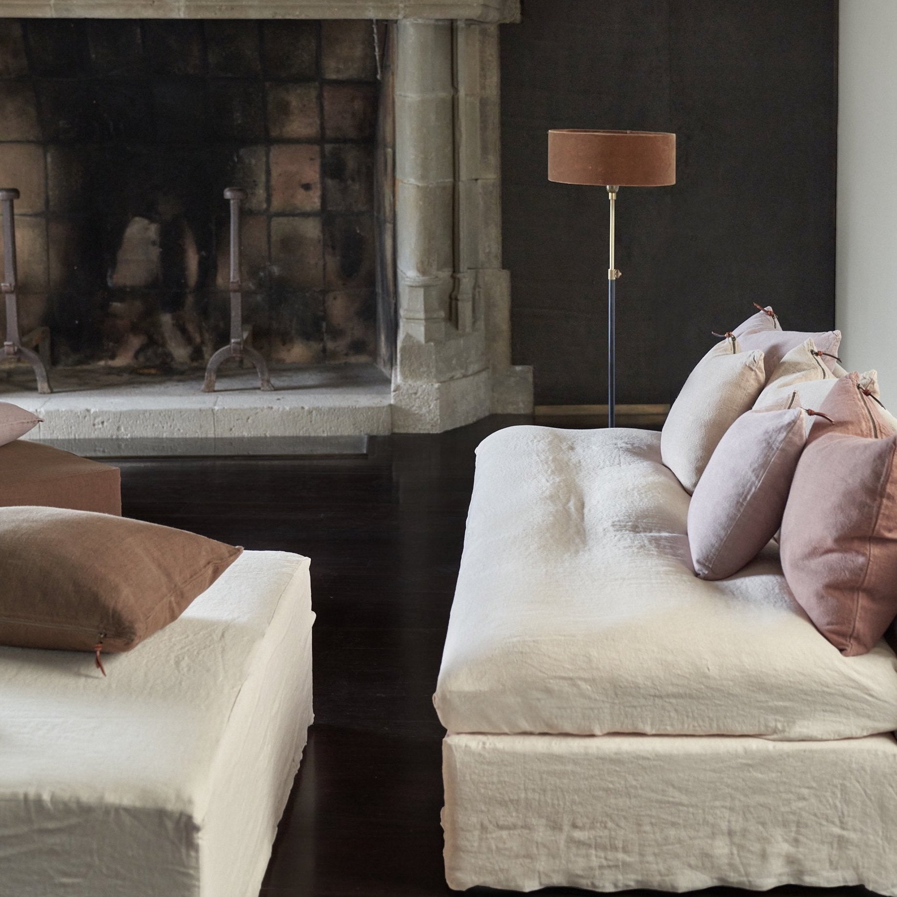 Sofá sin brazos con respaldo, estructura de madera tapizada en blanco, funda de lino lavado desenfundable.
