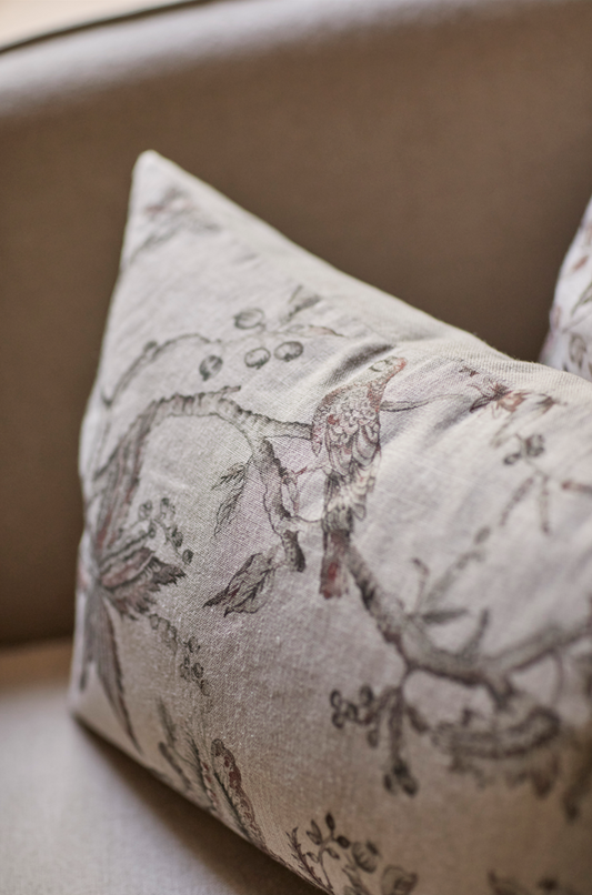 Cojín Estampado · Puro Lino Lavado · Toile pájaros y paislay