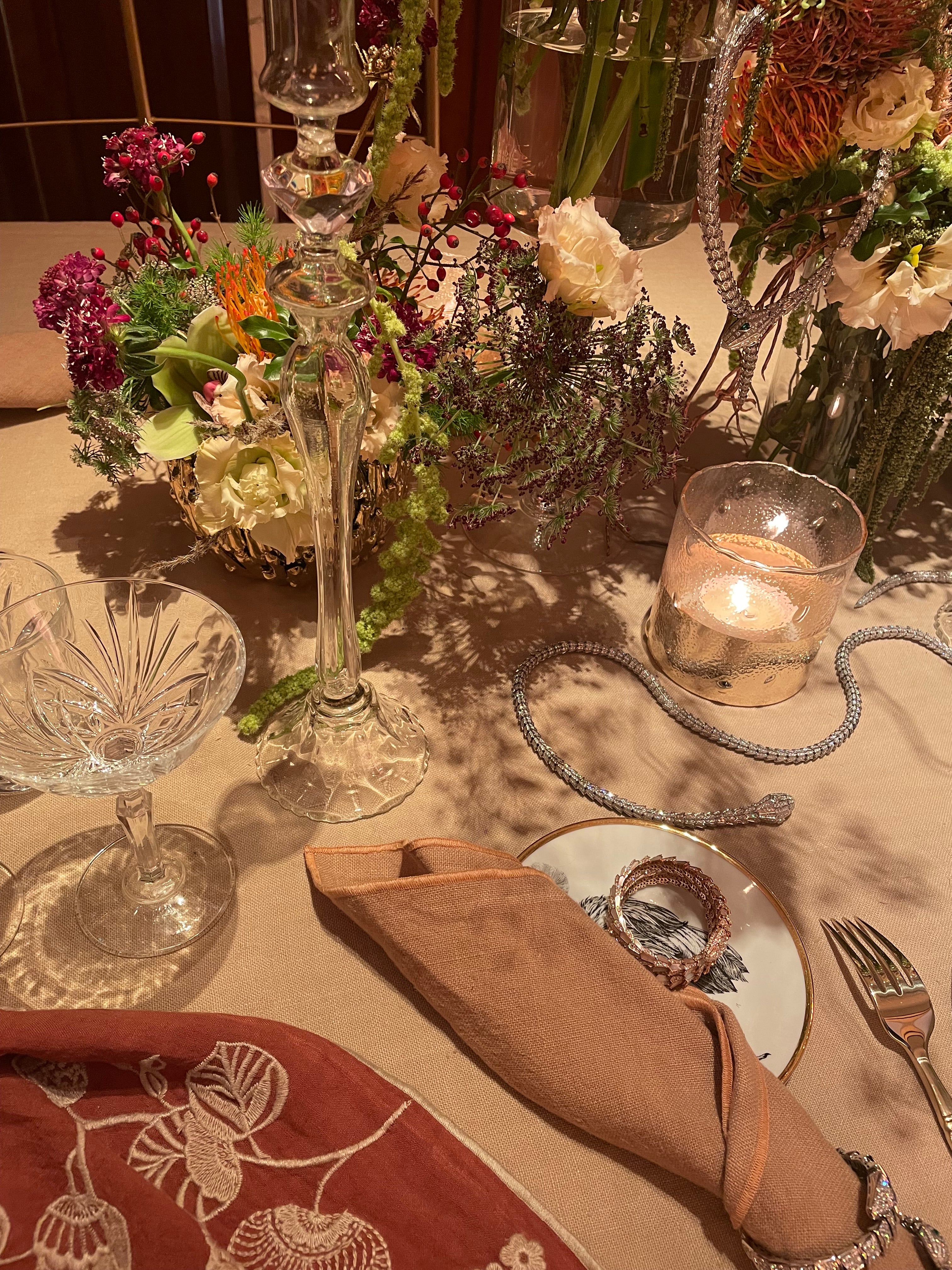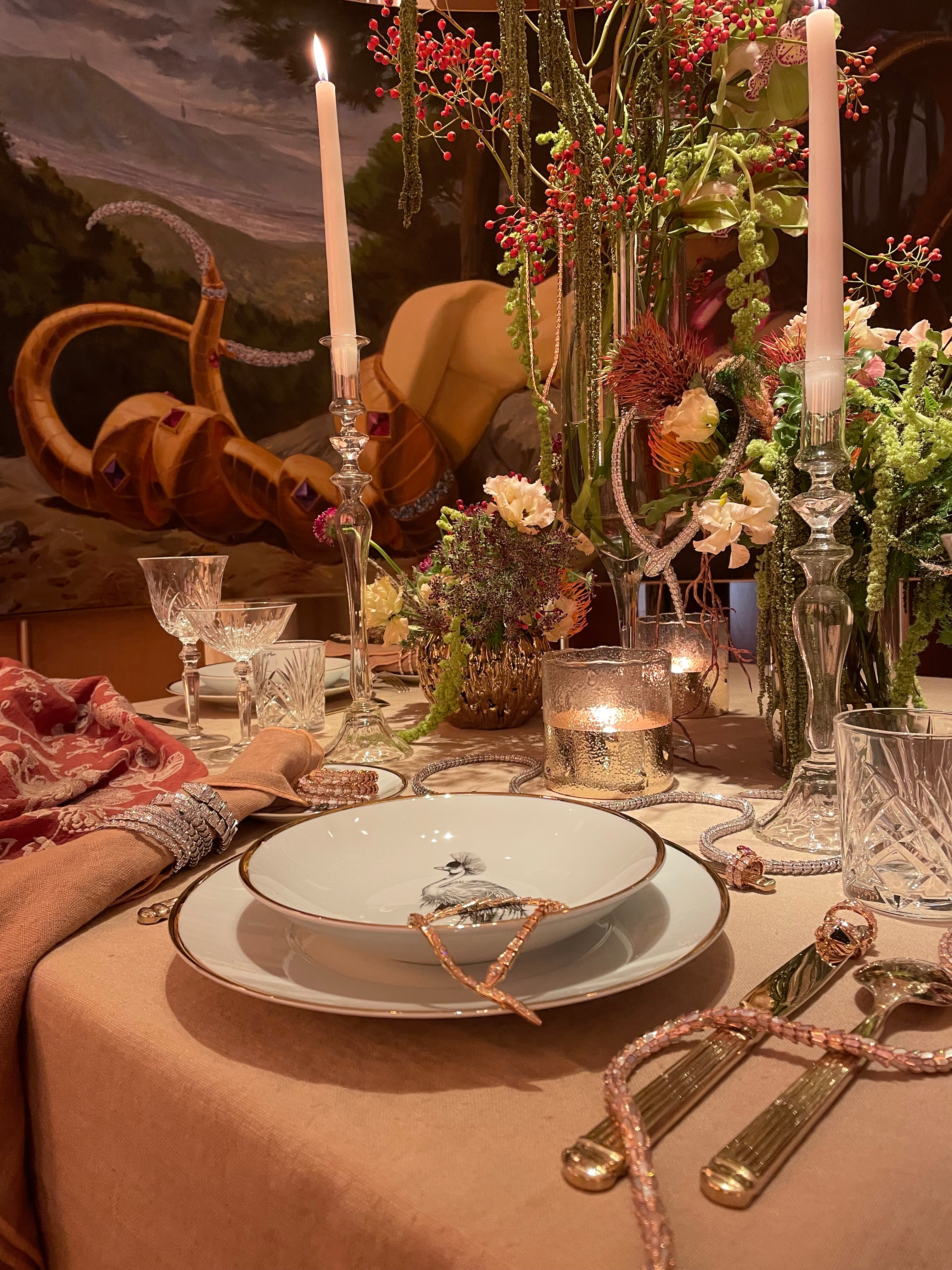 El montaje fue una oda a la elegancia audaz: mantel y servilletas de lino en tonos camel y burdeos, vajilla de Limoges con detalles en oro, y serpientes que recorrían la mesa como en un banquete mitológico. Los arreglos florales, pensados en distintas alturas, acompañaban la paleta del textil y dialogaban con los colores del cuadro de Monreal, creando un conjunto armonioso y envolvente.