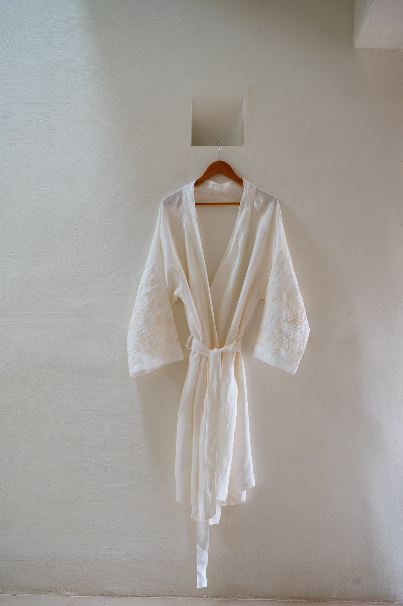 Bata Bordada · Puro Lino Lavado · Diseño Lavándula · Color Marfil