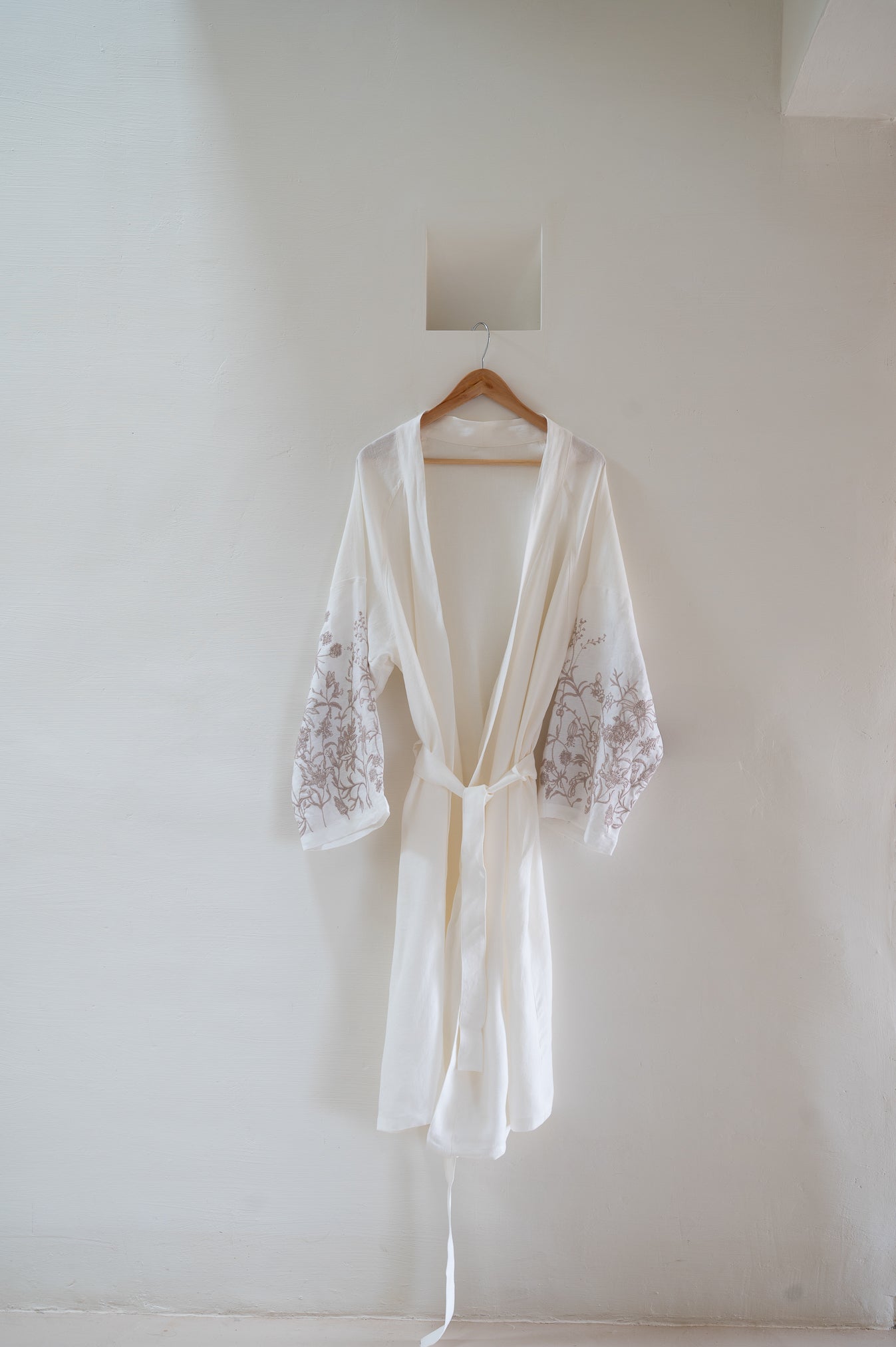 Bata Bordada · Puro Lino Lavado · Diseño Lavándula · Color Beige