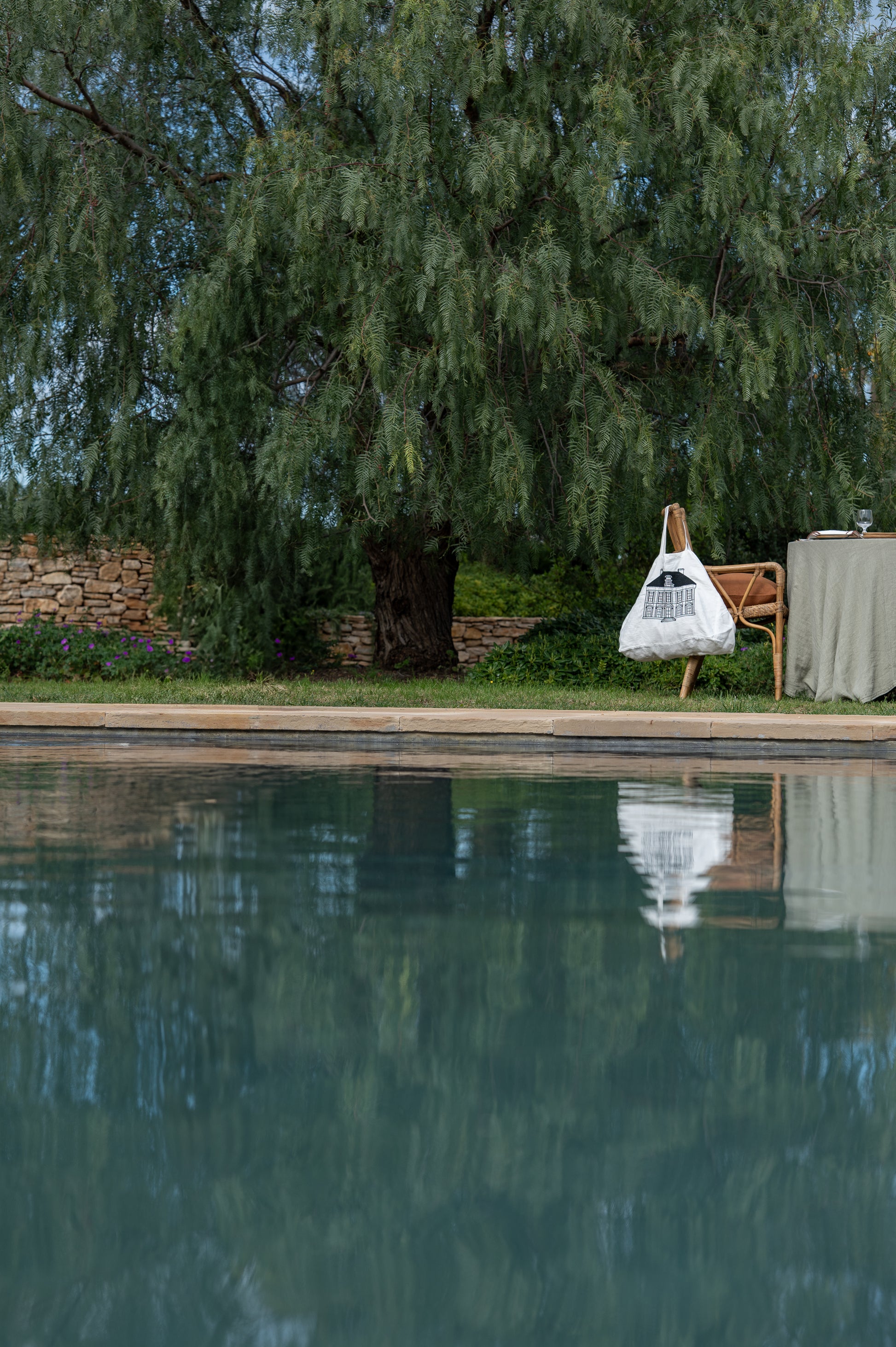 Bolsa de lino lavado en color marfil con bordado de La casa de lo de Manuela en color negro