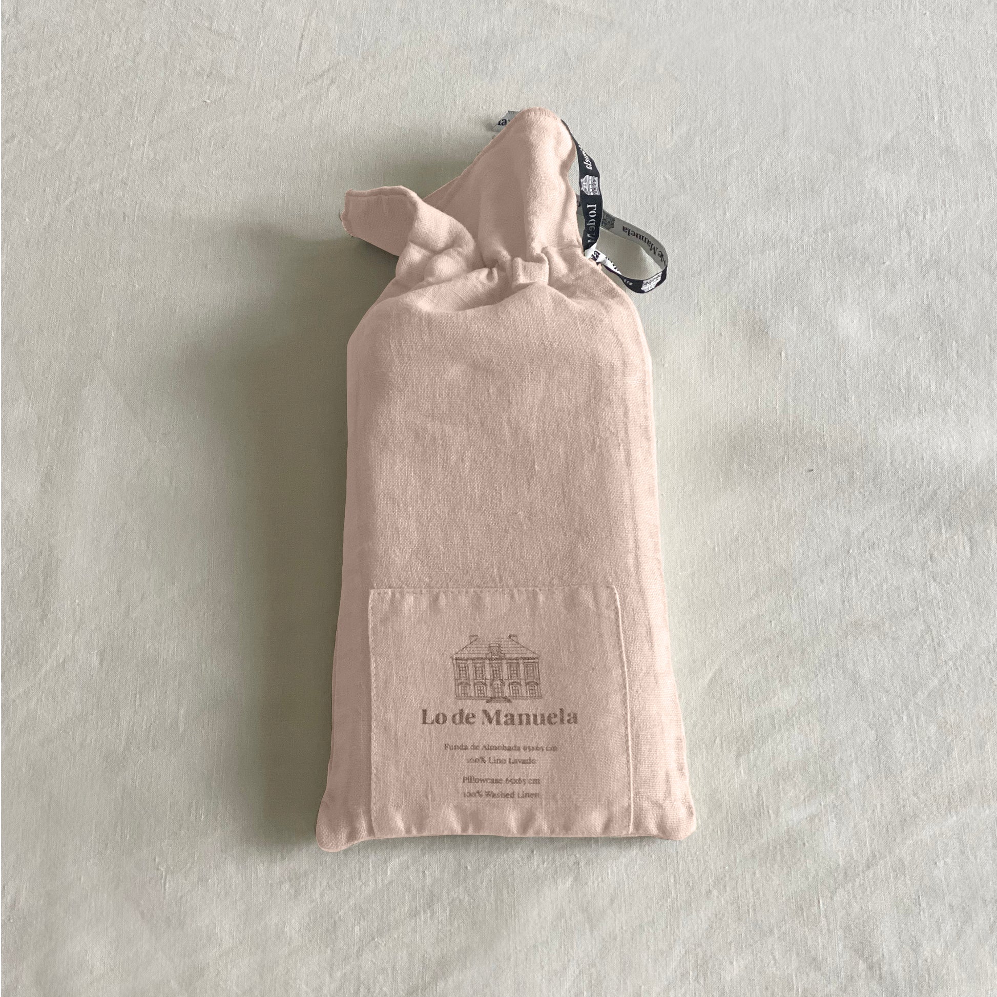 Funda de almohada de lino lavado color rosa palo con cremallera invisible.