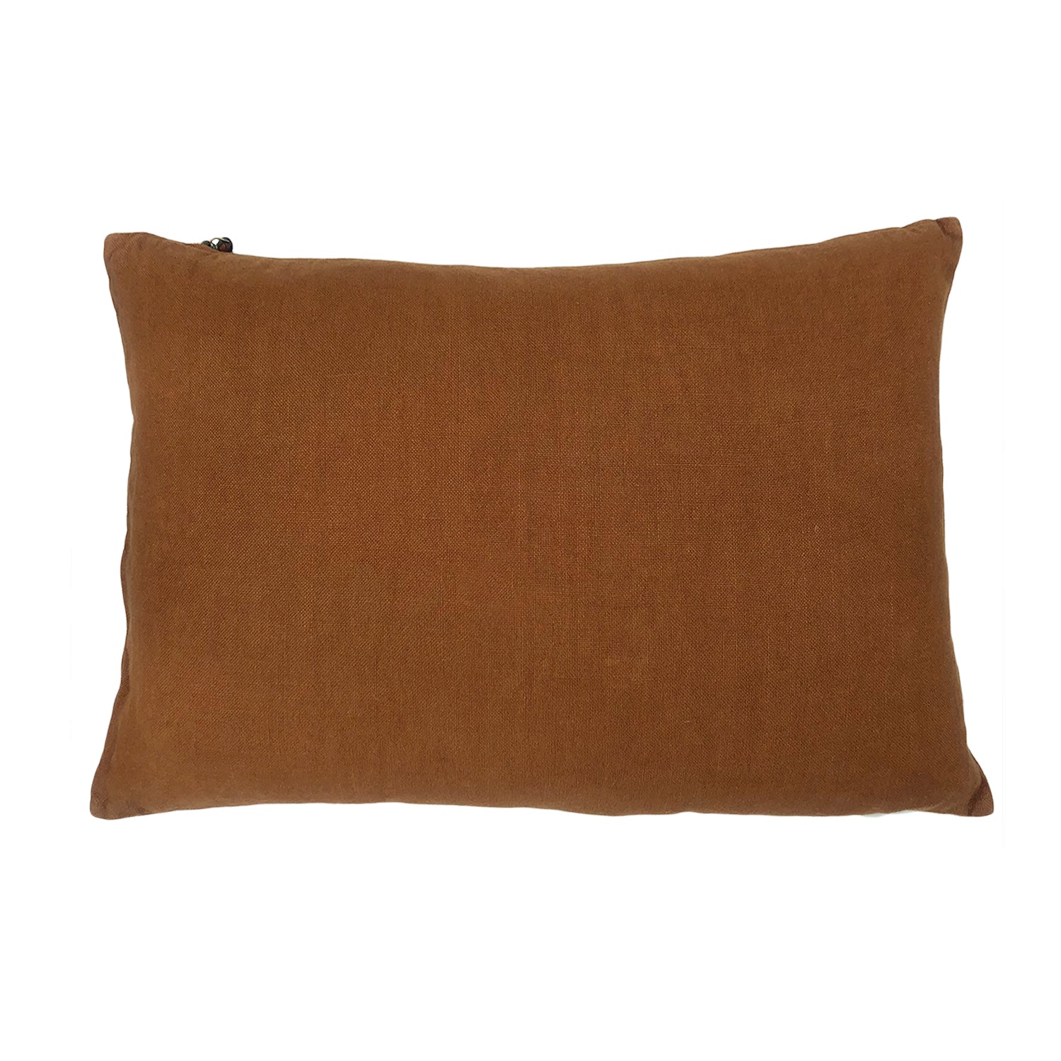 Housse de coussin en lin lavé, avec fermeture à glissière en métal vieil or et tirette en cuir à triple nœud.