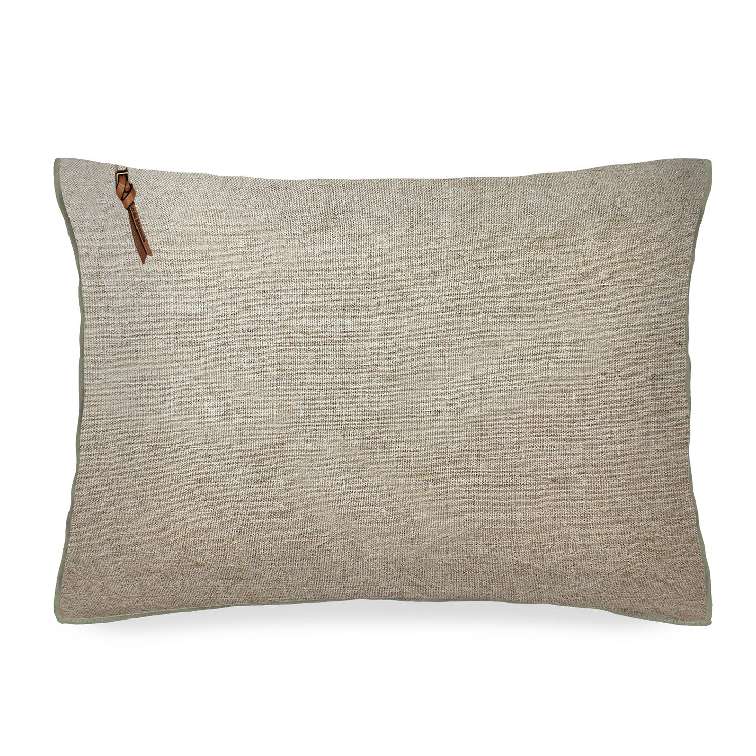 Housse de coussin en lin lavé en bégur naturel avec surjet en kaki avec fermeture à glissière métallique en vieil or et tirette à triple nœud en cuir.