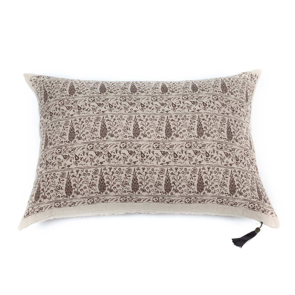 Housse de coussin en lin lavé, avec le motif Hayat imprimé à la main en deux couleurs, teinté dans la masse et orné d'un pompon original.