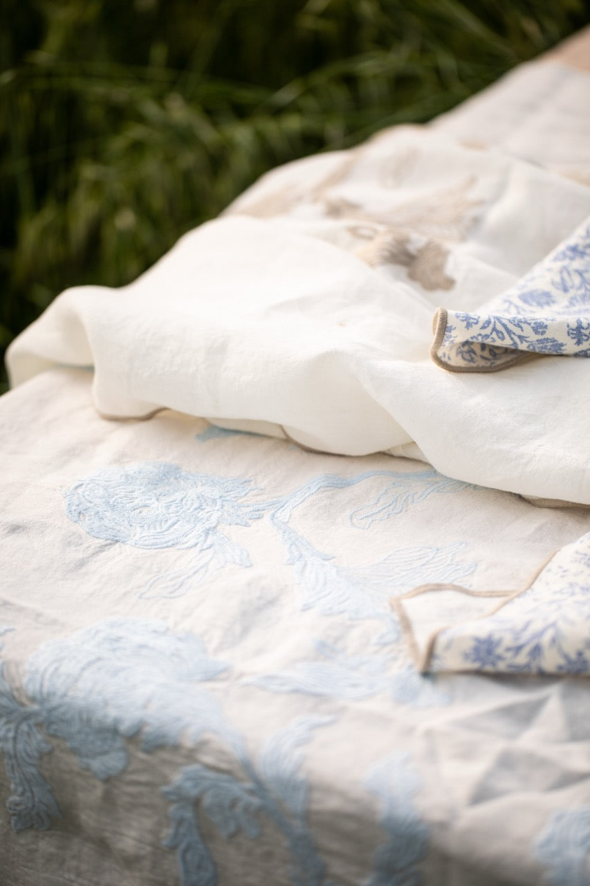 Mantel Bordado · Puro Lino lavado · Diseño Dominique · Azul