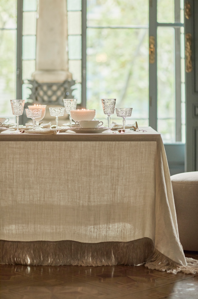En Petit Palace, la mesa se viste con nuestro mantel de lino lavado con flecos que realzan su diseño. La luz de las velas ilumina los platos y las copas, mientras los detalles de la mesa, servilletas, cubertería y cristalería, se combinan con el mantel para crear una velada elegante y cuidada. Cada elemento se integra en una escena de refinamiento, donde el lino y sus flecos marcan el ritmo de la decoración, aportando carácter, presencia y distinción a la mesa.