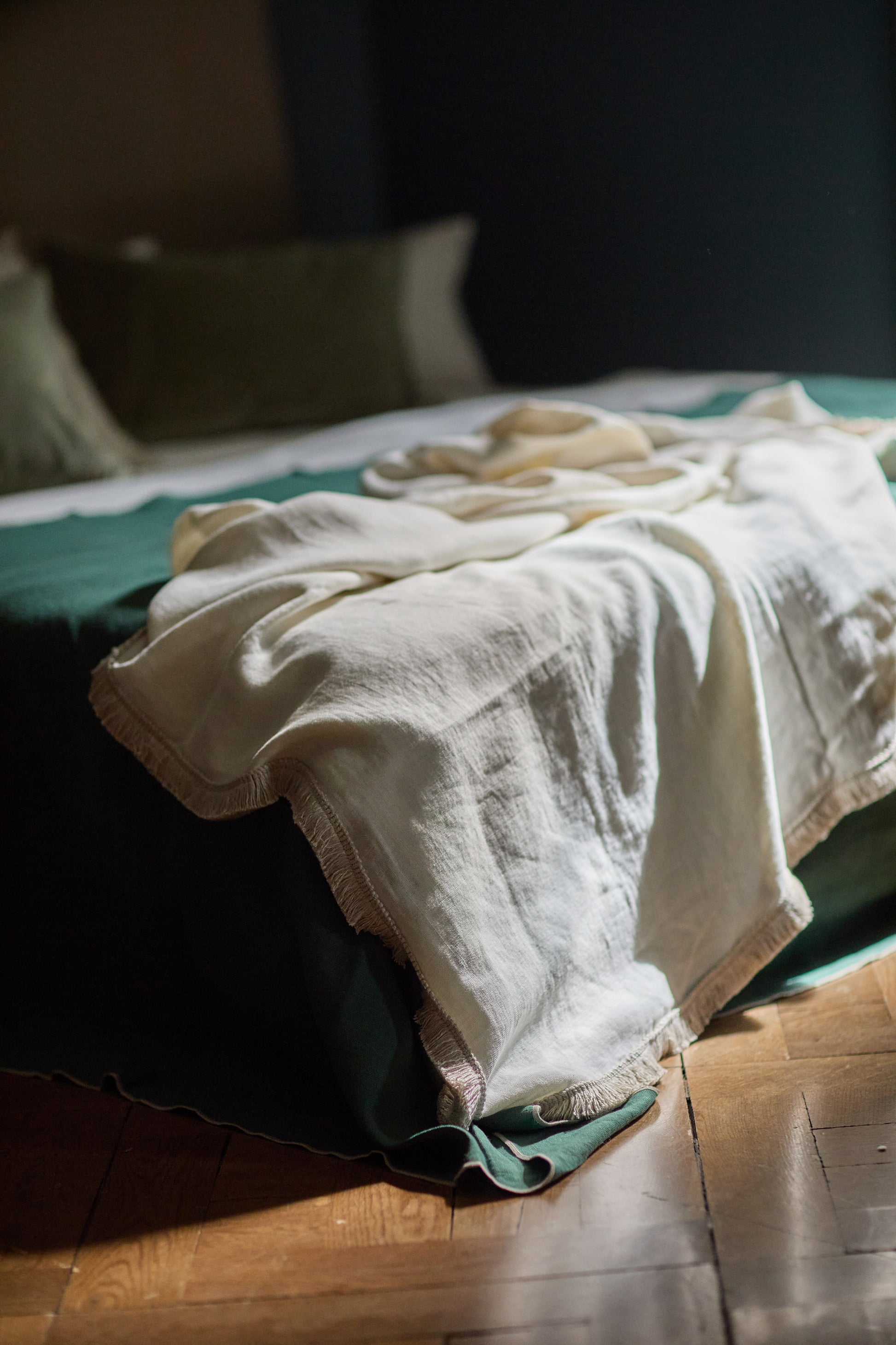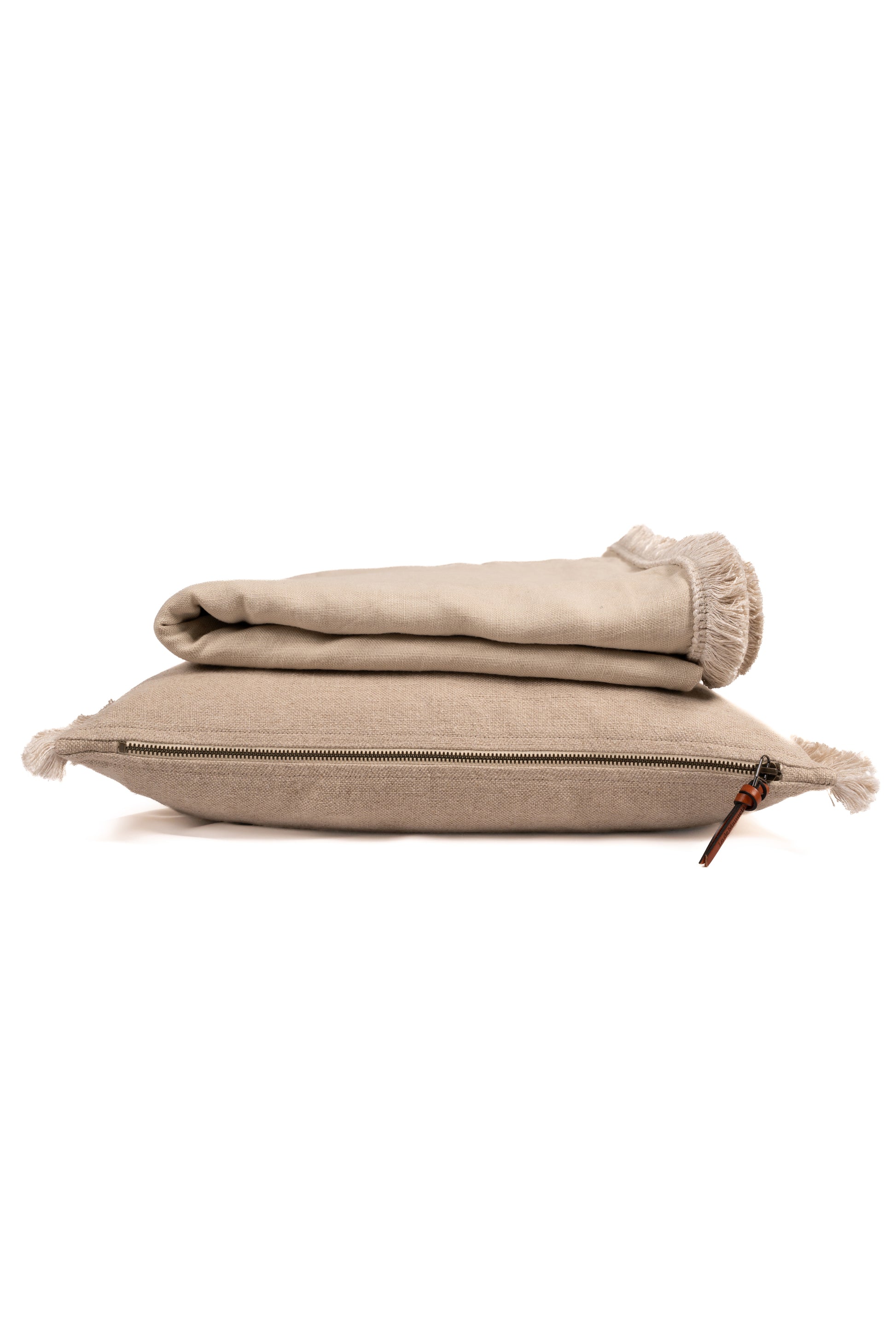 Plaid disponible en Beige y en Marfil con acabado alrededor de fleco de lino mezclado con viscosa.