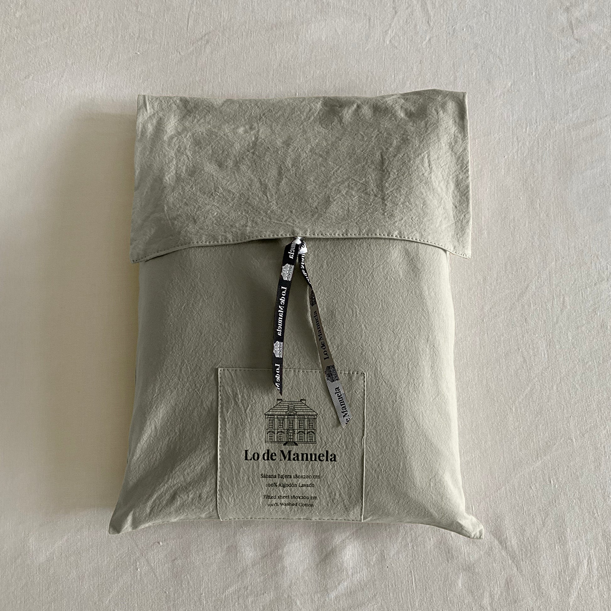 Sábana bajera con goma ajustable en color caqui de algodón lavado. El algodón tiene 225 hilos.