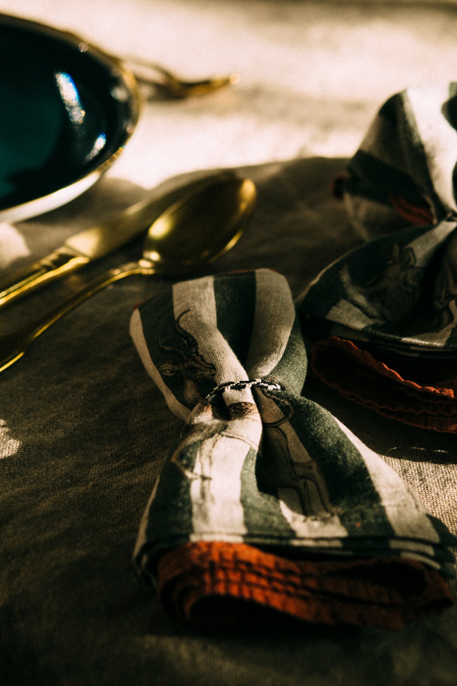 Servilleta de lino lavada de rayas verdes con animales . Acabado con ribete bordado en color ocre.
