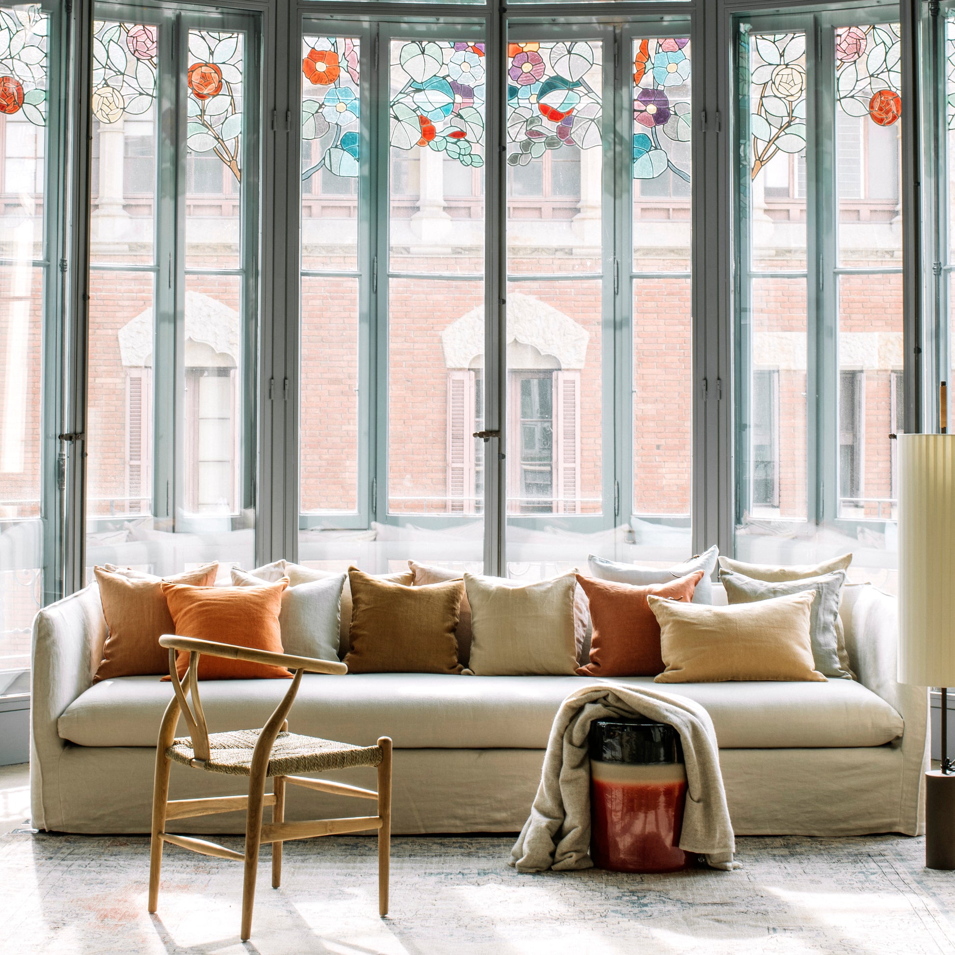 Canapé de 280 cm de long, divisé en deux modules de 140 cm reliés par une housse amovible en lin lavé.