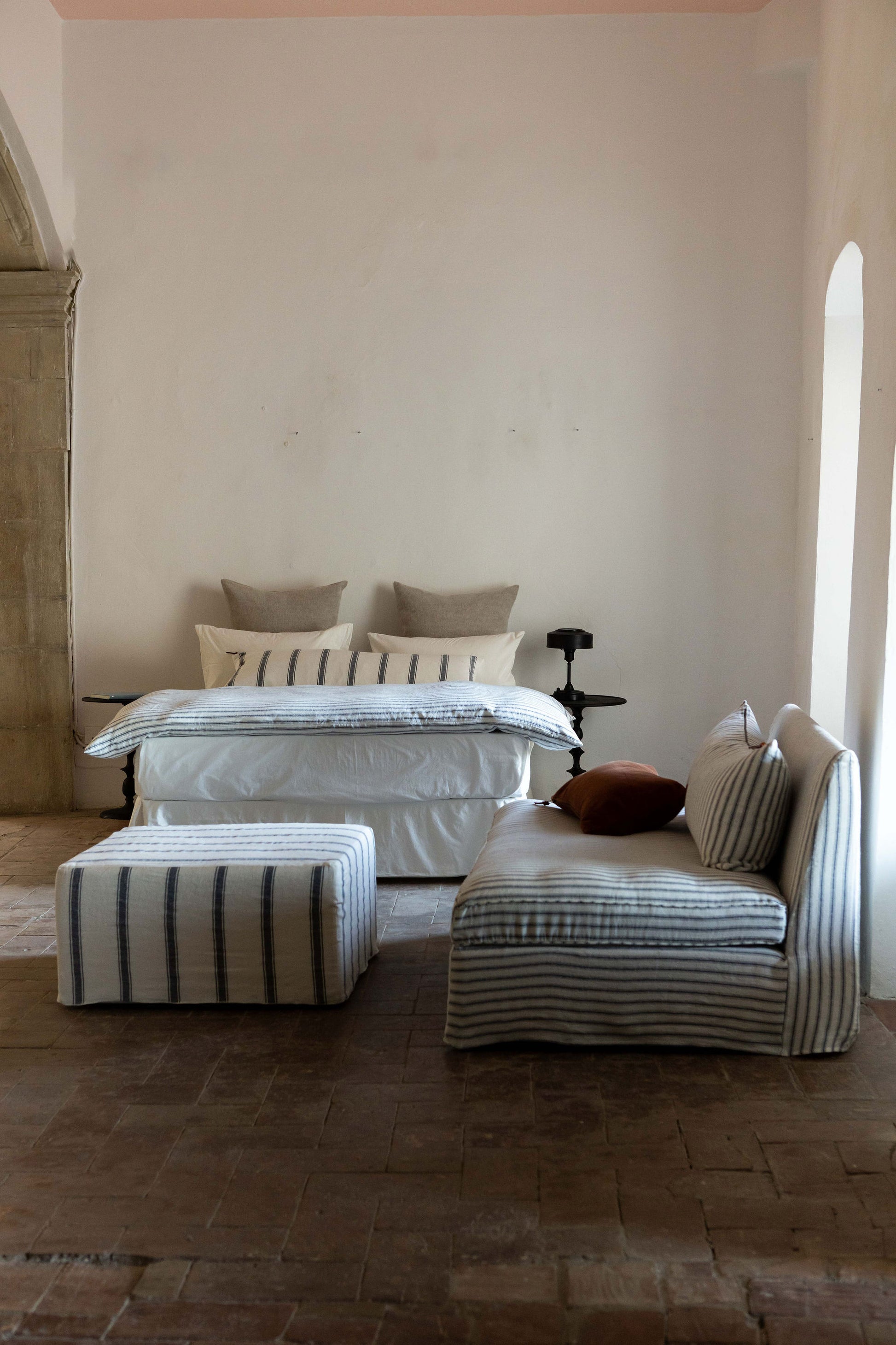 Puff es desenfundable. Su funda es de 100% lino tejido de rayas azul marino, tiene un peso de 250 gr/m² que asegura su gran resistencia y calidad.