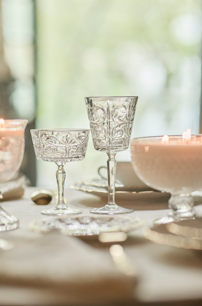 ...haciendo el clin clin clin previo al brindis de nuestra anfitriona, Manuela, las nuevas cristalerías labradas en colores y lisas, que son el acompañamiento perfecto para este festival de texturas y materiales nobles.