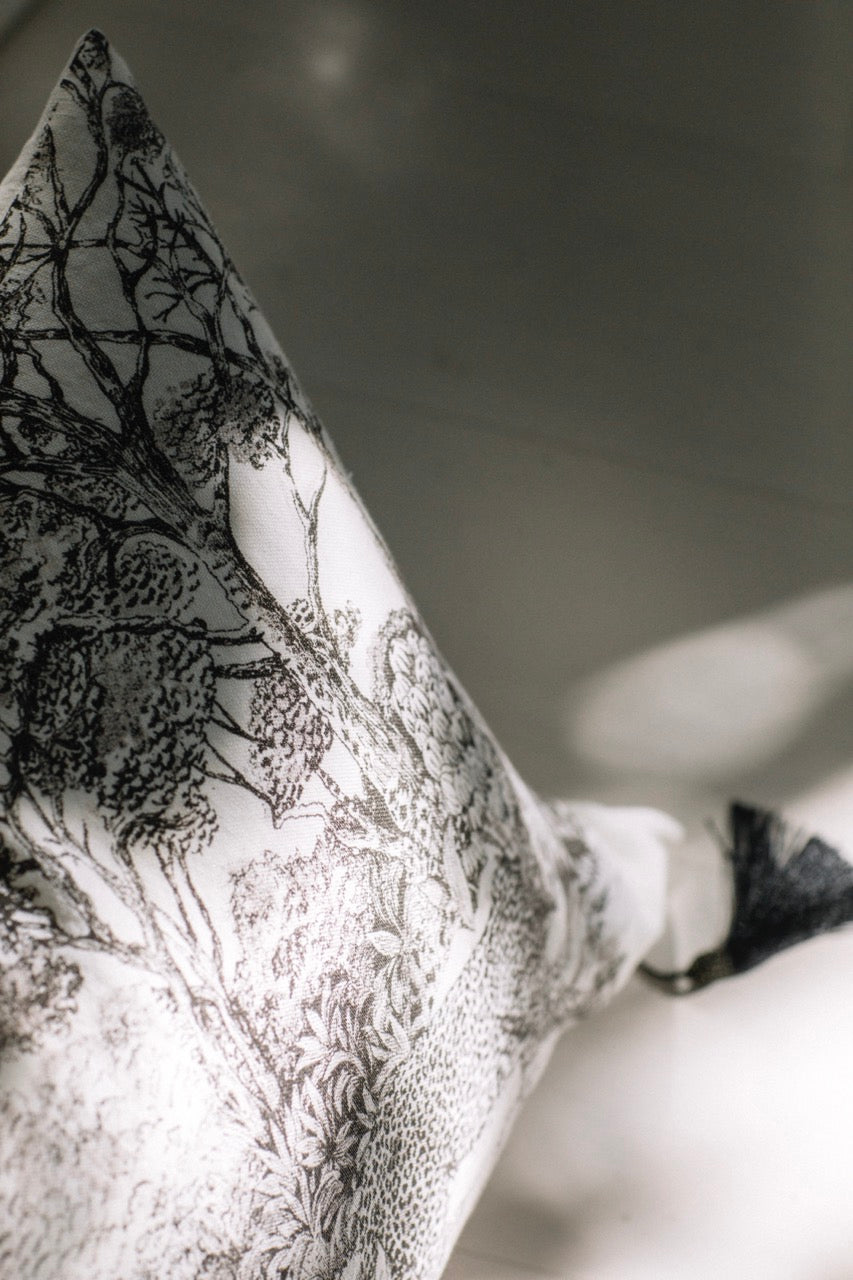 Funda de cojín de lino lavado en color blanco, con diseño toile de Jouy Jirafa. La pieza está serigrafiada a mano y cuenta con cierre de cremallera invisible. El lino, con un peso de 450 g/m², garantiza gran resistencia y calidad, mientras que su acabado con lavado en prenda aporta suavidad y confort. Cada funda es única, ya que la serigrafía se realiza artesanalmente: la tinta cubre el lienzo y el barniz define los detalles, dando vida a un diseño exclusivo.