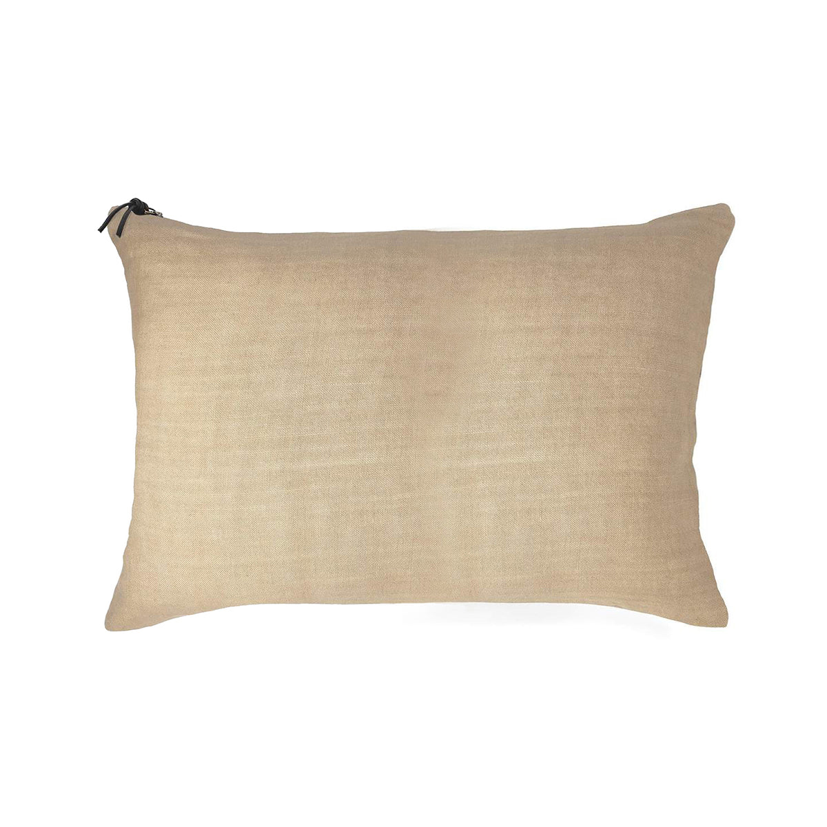Funda de cojín de lino lavado con cremallera metálica en oro viejo y tirador de triple nudo de cuero.