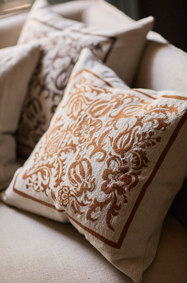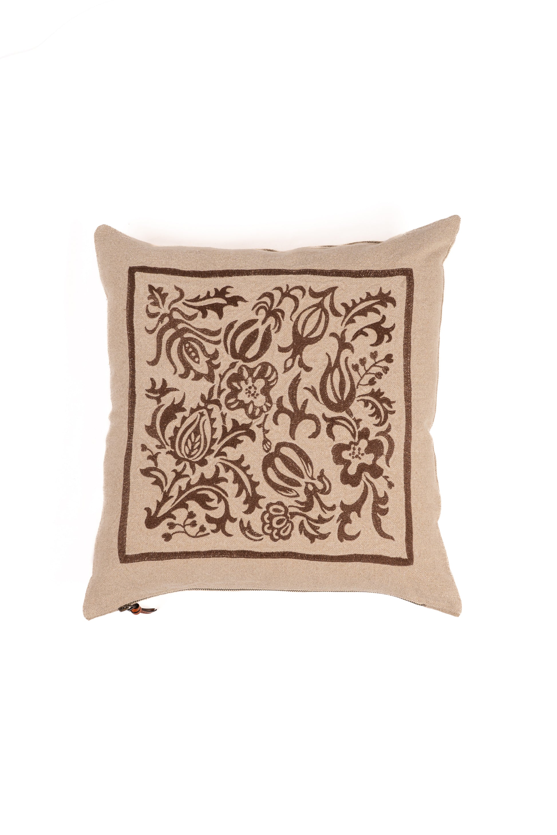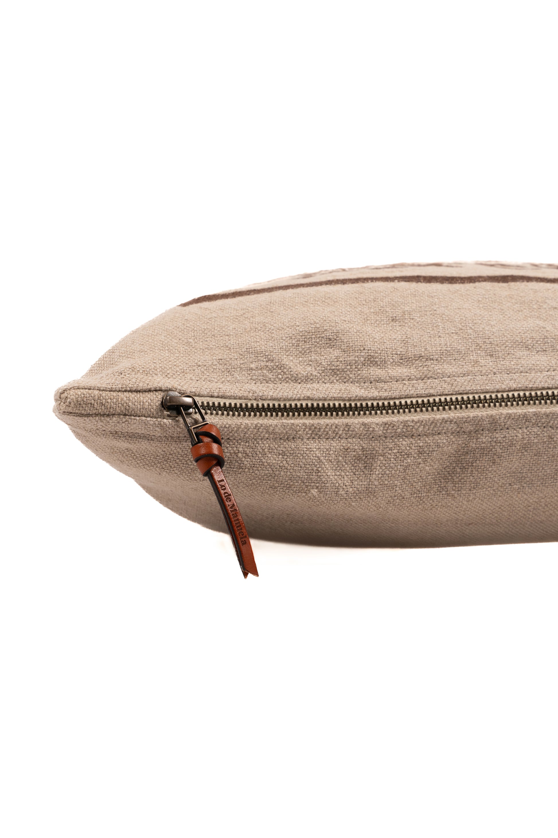 Funda de cojín de lino lavado con diseño bordado sobre lino natural en tres colores: moreno, marfil y canela. Cuenta con cierre de cremallera metálica en oro viejo y tirador de triple nudo de cuero.