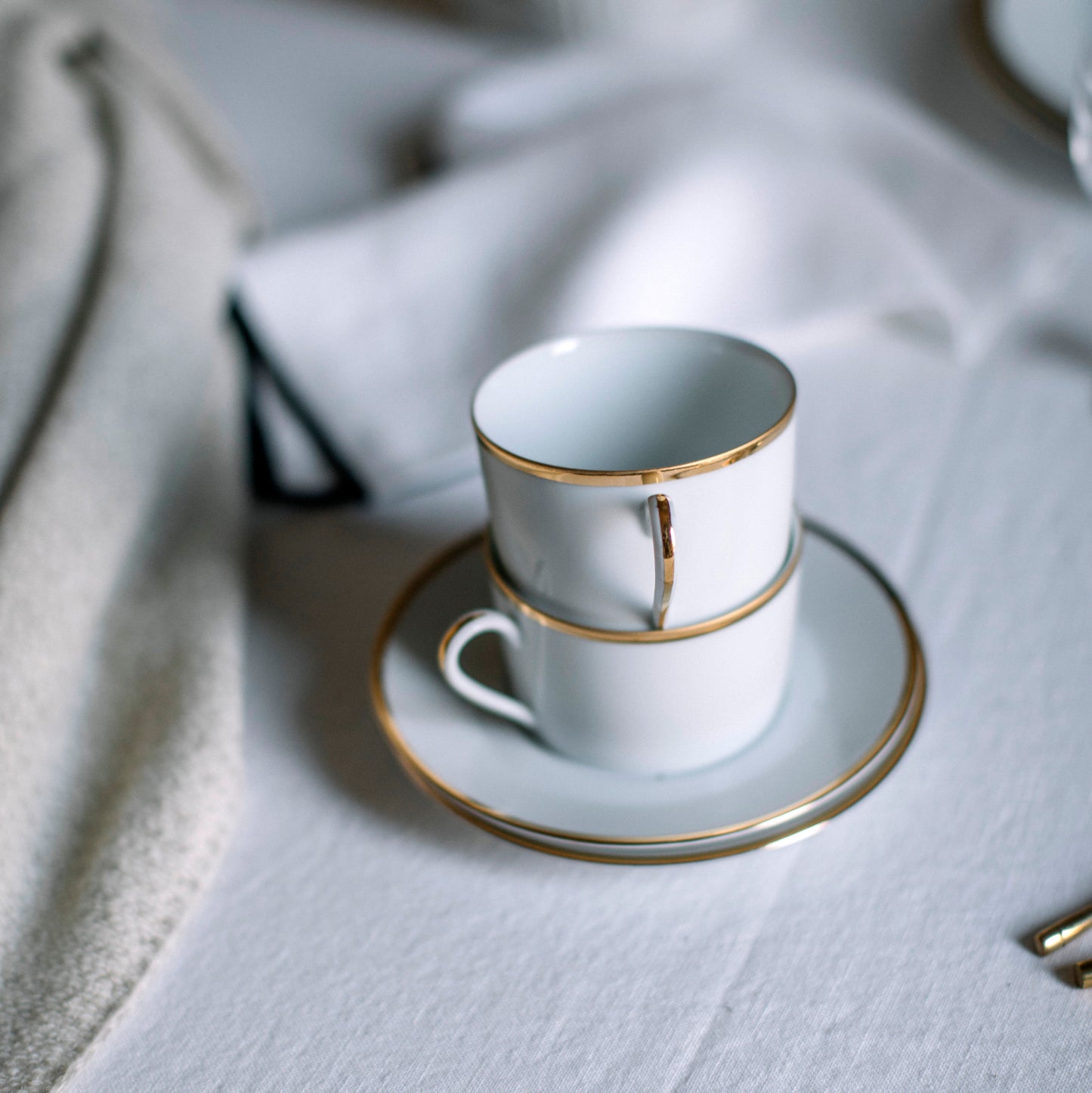 Taza de  té porcelana blanca con filo de oro pintado a mano.