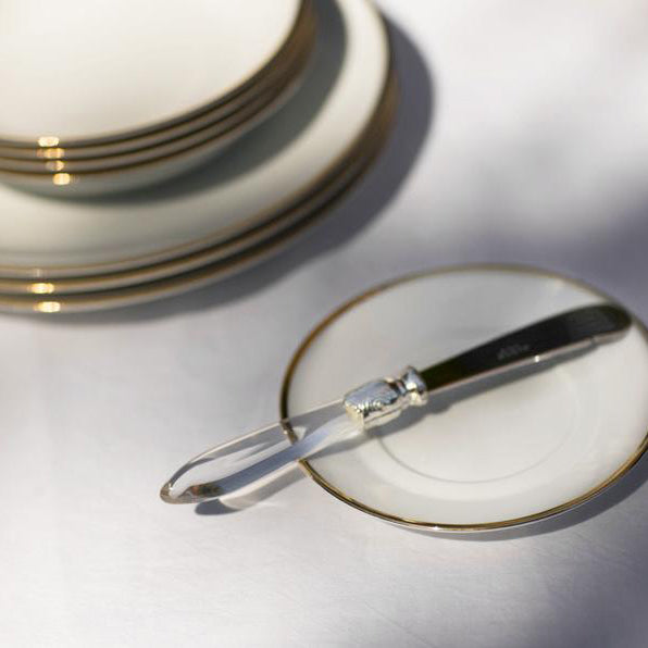 Vajilla de porcelana de Limoges blanca con filo de oro pintado a mano.