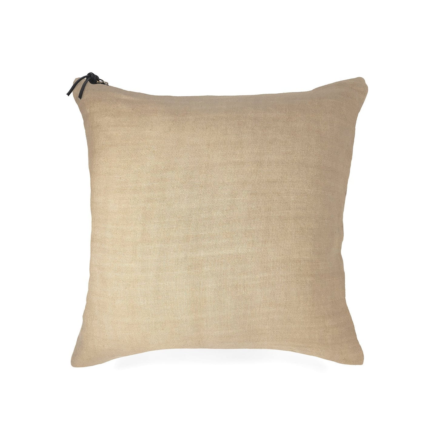 Funda de cojín de lino lavado con cremallera metálica en oro viejo y tirador de triple nudo de cuero.