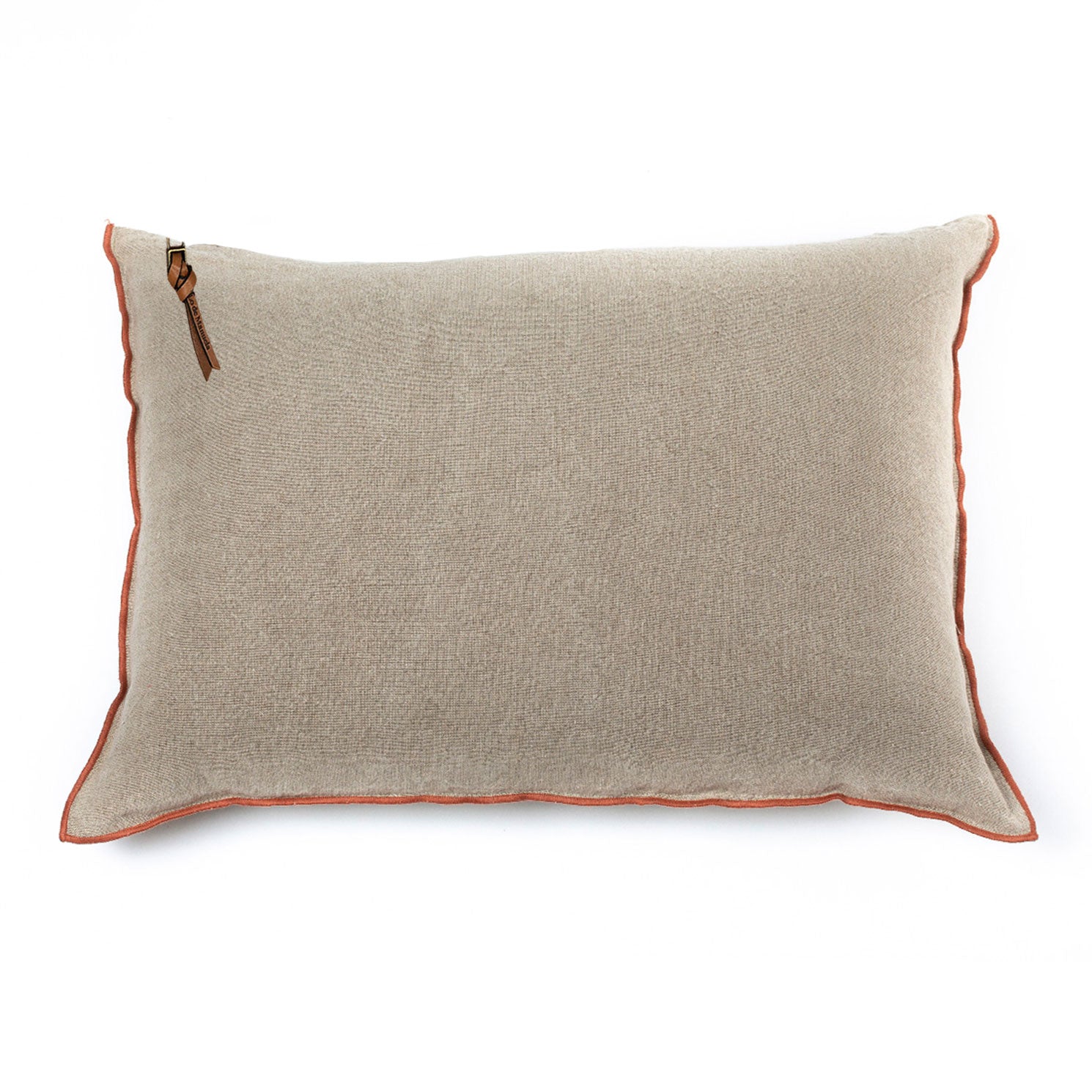 Funda de cojín de lino lavado en color beige con overlock en color naranja con cierre de cremallera metálica en oro viejo y tirador de triple nudo de cuero.