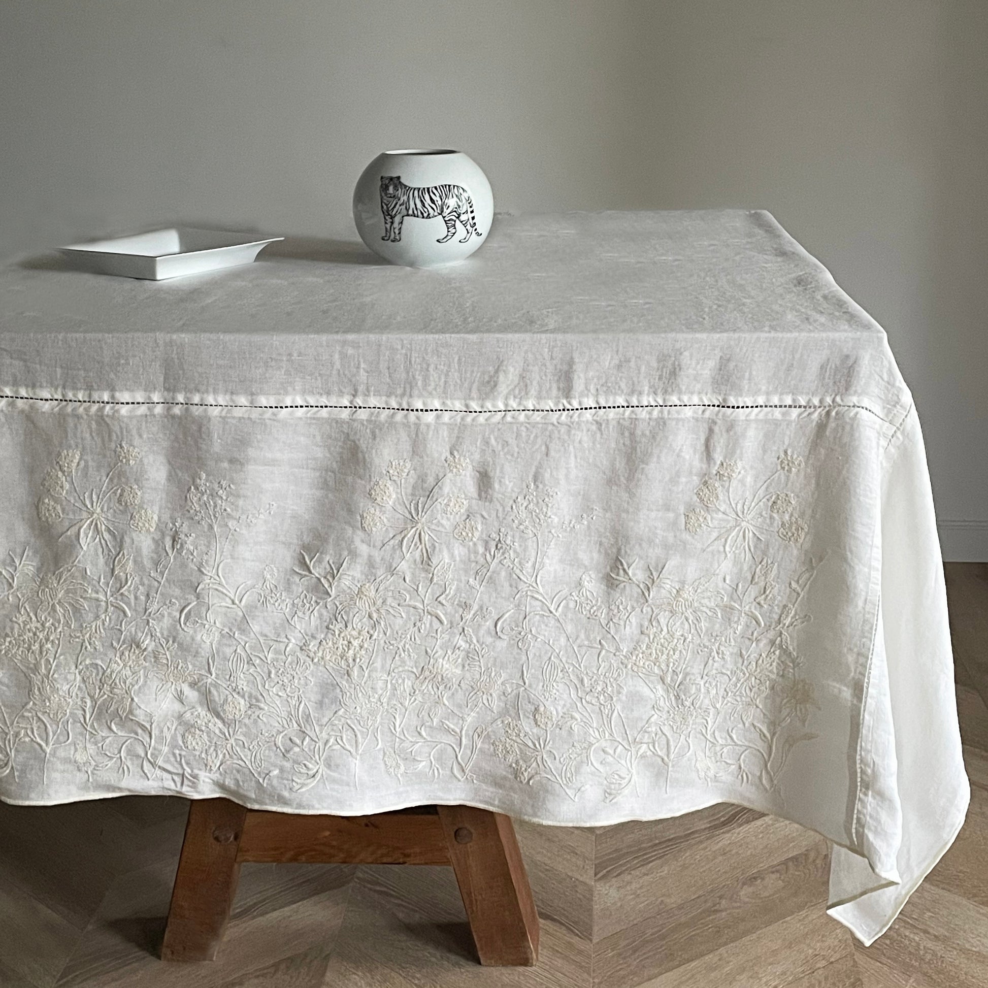 Mantel Bordado · Puro Lino Lavado · Diseño Lavándula · base Marfil/Marfil