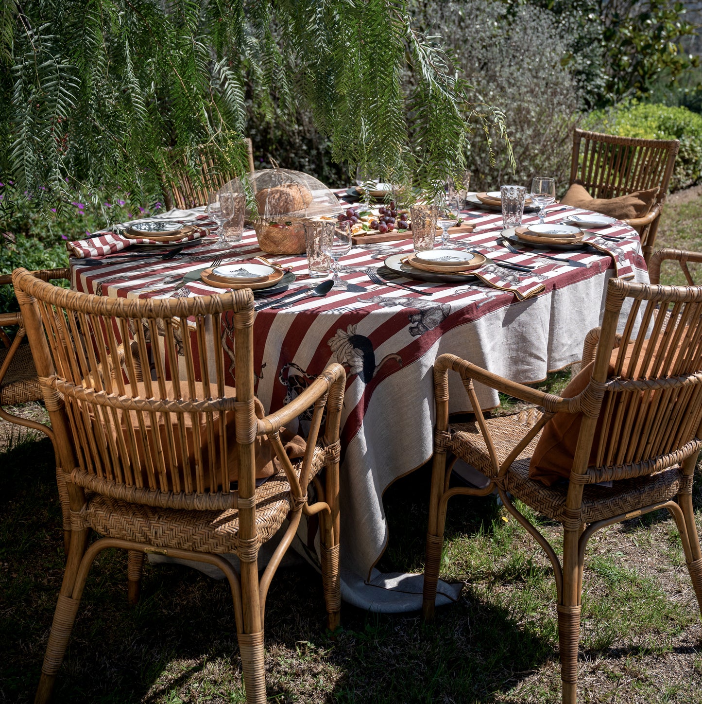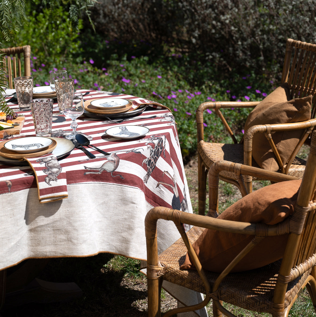 Hay piezas que, más que objetos, son pequeñas invitaciones al placer de vivir despacio. Este mantel de lino natural lavado es una de ellas. Sus rayas y el delicado estampado de animales en burdeos evocan esas mesas donde cada detalle cuenta, donde la conversación se alarga y el tiempo parece detenerse. El lino, noble y fresco, guarda la memoria de lo auténtico y convierte cualquier comida en un ritual sencillo, pero lleno de belleza.