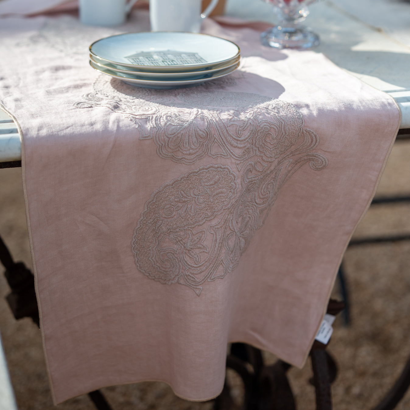 Camino de mesa diseño Great Britain con base en Rosa Palo y bordado en Beige. Confeccionado en lino lavado y teñido en prenda.