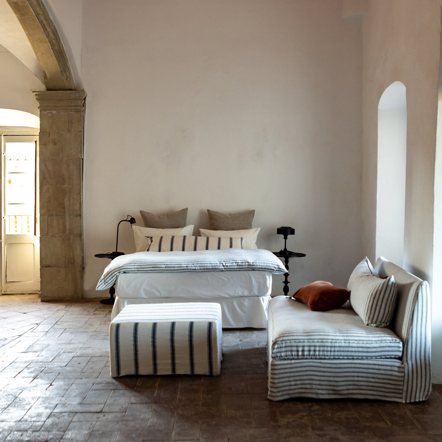 Puff es desenfundable. Su funda es de 100% lino tejido de rayas azul marino, tiene un peso de 250 gr/m² que asegura su gran resistencia y calidad.